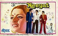 Neeyat (transl. Intention) is a 1980 Indian Hindi-language romantic action film, produced by Pradeep Sharma and Manoj Kaytee under the Screen Idol Productions banner and directed by Anil Ganguly. It stars Shashi Kapoor, Jeetendra, Rakesh Roshan, Rekha and Kalyanji Anandji composed the music.[2][3][4][5][6]