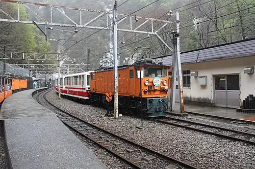 After the 2024 Noto earthquake, part of the Kurobe Gorge Railway was closed and the station was used as turning station. The platform was reopened for general passengers on October 5, 2024.[1] Following the opening of the station to general passengers and as an effort to make the station widely known, Kurobe Gorge Railway appointed a cat as the "honorary assistant" of the station.[2][6]