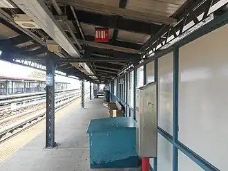 This station has three tracks and two side platforms. At the north end of the station, the northbound track ascends to pass over yard leads, while the others descend. A three-story tower is located north of the station which has an old blue and white letter sign "Warning — Do not lean over edge of Platform." North of this tower, two tracks enter the line from the 239th Street Yard.[15]