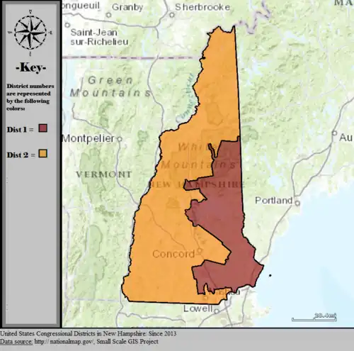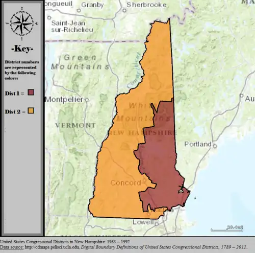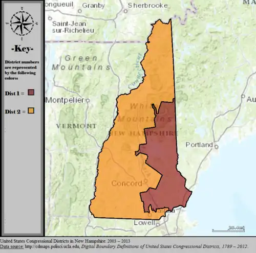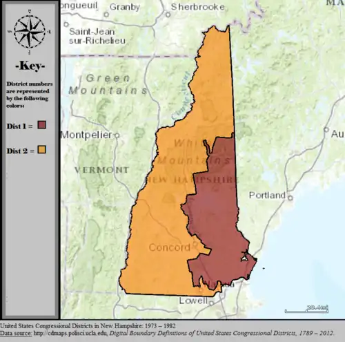Table of United States congressional district boundary maps in the State of New Hampshire, presented chronologically.[3] All redistricting events that took place in New Hampshire between 1973 and 2013 are shown. District numbers are represented by the map fill colors.