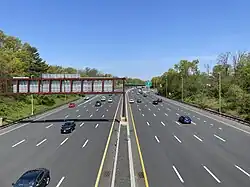 Immediately north of the toll barrier, the road divides into a local-express lane configuration with two express and three local lanes in each direction. The parkway passes to the east of a solar farm before reaching an interchange with Route 18 and Route 36, which head north towards New Brunswick and east towards Long Branch, respectively. The connector road from the parkway to the western terminus of Route 36 and Hope Road (CR 51) is designated by the New Jersey Department of Transportation as Route 444S.[9] North of the interchange, the Garden State Parkway passes over the Southern Secondary railroad line operated by the Delaware and Raritan River Railroad and bisects residential neighborhoods before crossing the Swimming River into Middletown Township, where the road has an interchange with CR 520, which contains a park and ride and serves Red Bank and Lincroft. The parkway then passes over Normandy Road, which serves as a road and railroad link between the two sections of Naval Weapons Station Earle. Continuing northwest past houses and parks, the route has an interchange with Red Hill Road (CR 52) as it enters Holmdel Township, where it serves the PNC Bank Arts Center and the New Jersey Vietnam Veterans' Memorial. Upon entering Hazlet, the parkway crosses NJ Transit's North Jersey Coast Line before reaching an interchange for Route 35 and Route 36, which serves Keyport. At this point, the express roadway in each direction gains a third lane. Immediately north of here is a southbound exit and entrance at Lloyd Road (CR 3), where the parkway briefly enters Aberdeen Township and passes over the Matawan Creek before crossing the North Jersey Coast Line for a second time while the southbound lanes of the parkway briefly enters Matawan. Upon entering Old Bridge Township, Middlesex County, and reaching an interchange for Matawan Road (CR 626) serving Matawan, the highway enters Cheesequake State Park.[1][3]