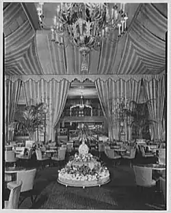 On the 23rd story of the hotel was the grand ballroom and banquet hall.[12][13] The grand ballroom was called the Cascades because there was a large waterfall at one end.[48] It was designed in the Louis XVI style[5][50] and was decorated in a gold and blue color scheme.[50] The ballroom and banquet hall contained loges, with box seating, on three sides.[12] The ballroom also had movable windows, which measured 10 by 25 feet (3.0 by 7.6 m). The ballroom was typically used for lunch, dinner, and banquets, although visitors could only enter by invitation. The center of the ballroom was used as a dance floor at night.[48] During the summer months, the hotel's managers could open the windows and convert the ballroom into an open-air loggia;[12][9][34] this was a major amenity for guests before air conditioning became popular.[25] The ballroom also had its own foyer, assembly room, lounging room, bar, and kitchen.[8][12] The space could have a capacity of 600 people.[34] North of the grand ballroom was a first-aid wing.[7]