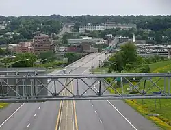 In Schenectady County, Schoharie Creek breaks from NY 30A and returns to the vicinity of NY 30 as it intersects U.S. Route 20 (US 20) in Esperance. From Esperance northward, the creek becomes roughly equidistant from both NY 30 and NY 30A as all three entities cross into Montgomery County. Near the northeastern corner of the county, NY 30 enters the city of Amsterdam. The route meets the New York State Thruway (I-90) and NY 5S via separate interchanges before heading downhill as a four-lane divided highway approaching the Mohawk River (here part of the Erie Canal). Historically, the bridge over the river was a straight line to Market Street, which is visible as one approaches northbound. Segments of downtown Market Street remain in use today. With the 1977 creation of the Amsterdam Mall, NY 30, together with NY 5 and NY 67, were re-routed onto splits.[7][8] After the splits rejoin, NY 30 continues on Market Street and leaves the city and, for all purposes, the county.[4]