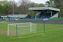 The club play at the Lyme Valley Stadium, next to the Lyme Brook on Buckmaster Avenue. The ground doubles as a velodrome, with a cycling track around the pitch.[6] The ground includes a seated stand on one side of the pitch and a covered standing terrace on the other.[6] Both ends of the ground consist of uncovered standing areas.[6] It currently has a capacity of 4,000, of which 300 is seated and 1,000 covered.[1]