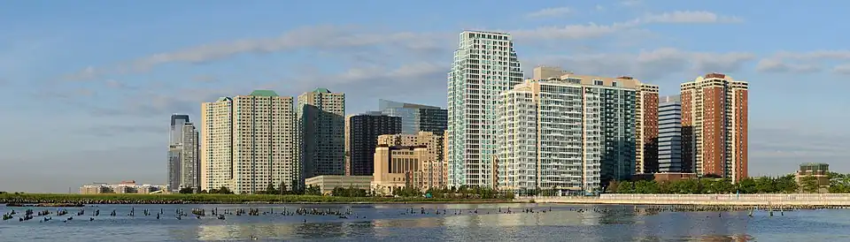 As of 2014, the population of Newport is 15,000.[7] Newport's approved master Redevelopment Plan contains an 'as-of-right' entitlement to build 9,000 units of residential housing. Newport currently includes 10 high-rise rental apartment buildings comprising approximately 4,000 households. Construction of these buildings began in 1985. Newport's 10th rental apartment building, "The Aquablu," was completed and occupied in 2009. Newport also includes 3 high-rise condominium apartment buildings comprising approximately 900 additional households. Construction of these condominium buildings began in 1987. The most recent condominium building, known as "The Shore Condominiums at Newport, North Tower" was completed in 2008. Several adjacent residential buildings just south of Thomas Gangemi Drive along the 10th Street embankment are outside of the Newport Redevelopment Zone,[8] but because they are developed by the LeFrak organization,[9] are often advertised by real estate professionals as being in Newport.