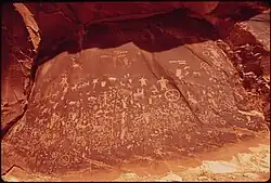 People of the Archaic, Basketmaker, Fremont, and Ancestral Puebloan cultures carved petroglyphs on Newspaper Rock from around the beginning of the current era until about 1300. Ute, Navaho, and Anglo people have also left carvings on the rock in historic times.[2] There are over 650 rock art designs. The drawings on the rock are of different animals, human figures, and symbols. These carvings include pictures of deer, buffalo, and pronghorn antelope. Some glyphs depict riders on horses, while other images depict past events. While precisely dating the rock carvings has been difficult, repatination of surface minerals reveals their relative ages. The reason for the large concentration of the petroglyphs is unclear. One suggested explanation is that the rock was used as a place for communication through the petroglyphs between travelers.[3]