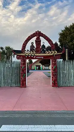 The main wharenui of the marae is named Aoraki, in reference to the Māori creation myth of the South Island.[1] It is the largest wharenui of its kind in New Zealand.[1][2] The construction utilised local unemployed people as labourers, to give opportunities to the community.[2] One of the wall carvings depicts explorer James Cook, to represent that Pākehā are also welcome.[2]