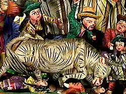 Pishtaco (Pistaku, "cutter of throats", from Quechua: pishtay 'to slit a throat') according to the oral tradition among the Andean people, are foreigners who use knives and machetes to extract their fat, and the victims eventually die after a few days.[12][13] The piece "Pishtaco" by Nicario (which exists in multiple copies of different make)[14][15] is three-tiered, and the middle tiers is a throw-back to the 1960s[a] with hacendado on horseback, also showing automobile and airplane (of models from that age).[16] The military aircraft symbolize state authority, or perhaps the dominant group.[17][b]
