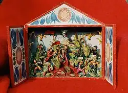 He makes traditional Andean altarpieces, small wooden boxes filled with figures, animals and other objects that tell a story. His altarpiece figurines are made by hand with a mix of boiled potato and gypsum powder.[4]