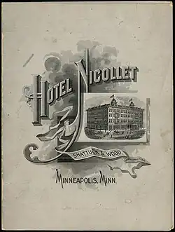 The original hotel on the site (often called the Nicollet House Hotel) was built in 1858. Named after Joseph Nicollet, the hotel quickly became a landmark and many of the city's early prominent figures such as John S. Pillsbury and William D. Washburn worked out of it.[1] Over the next half-century it was expanded and remodeled several times, but by the 1920s found itself obsolete. In 1922 city inspectors ordered the installation of a fire sprinkler system which the owners deemed too expensive. The old hotel was demolished in 1923.[2]