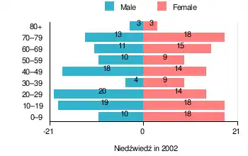 According to the 2002 Poland census, Niedźwiedź had a population of 226, with 47.8% male and 52.2% female residents. The population was distributed with 25.7% under age 18, 29.6% from 18 to 44, 19% from 45 to 64, and 25.7% aged 65 or older.[1]