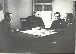 A fluent German speaker, Captain Dyatlenko was transferred to the 7th Department of the Stalingrad Front in the autumn of 1942 to help with the interrogations of German prisoners of war.[6] Antony Beevor claims that he was a member of the NKVD,[7] but this is not supported by his military records. There is no mention of this in Dyatlenko's account of the ultimatum delivery, and the index in John Erickson's Road to Berlin lists him as a Red Army officer.[8]