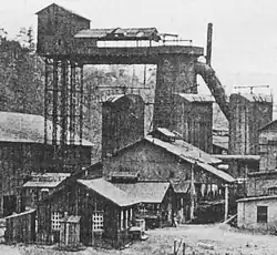 The preliminaries to the furnace's construction began in 1885, when Valentine and Thomas, an old ironmaking firm of Bellefonte, decided to sell off its properties. These then consisted of Bellefonte Forge, on Logan Branch just south of Bellefonte, and Bellefonte Furnace, a cold blast charcoal iron furnace lying about a mile south of the town, also on Logan Branch,[1] as well as holdings in local iron ore mines. Both plants were served by the Bellefonte, Nittany and Lemont Railroad, a subsidiary of the PRR. The ironworks and ore lands were bought on August 2, 1886, for $400,000, by the Valentine Ore Land Association,[2] whose principals organized the Centre Iron Company to erect a new iron furnace on the site of Bellefonte Furnace, which was to be torn down. A $600,000 mortgage was immediately raised on the properties, to supply the purchase money and funds for rebuilding the furnace.[2] The leaders of the company included Edmund Blanchard, W. M. Stewart, and B. K. Jamison, a Philadelphia banker.[3] The plant was built in 1887,[4] and the Nittany Valley Railroad was built to supply it with ore. It became necessary to raise additional funds, and in 1887, the Pennsylvania Railroad purchased $75,000 worth of bonds in exchange for exclusive rights to rail traffic to and from the furnace. The first load of ore was delivered by the Nittany Valley on February 28, 1888, and the furnace went into blast on March 4, 1888.[5] The company was originally headed by Jamison,[6] but by 1890, James B. Coryell was president and Jamison vice-president. At this time, the furnace had one 70-foot (21-meter) stack and three hot-blast stoves, with a capacity of 30,000 tons (27,200 tonnes) of iron per year. Ore was supplied from local hematite deposits, and the furnace was fuelled by Connellsville coke.[4] In the same year, however, the failure of Jamison's bank precipitated the closure of the furnace by the sheriff on November 15, 1890. It was subsequently sold under foreclosure.[7]