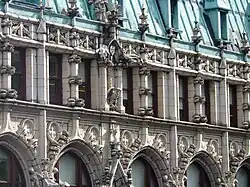 Along Broadway, the Townsend (1896) and St. James (1896) were the tallest buildings in New York for a short while, and remain historic landmarks. Slightly up the street, the Baudouine Building at 28th Street was heavily decorated with escutcheons of anthemions with lion heads over many windows. At the same corner, the Johnston Building (now the Hotel NoMad) was built in 1900 and faced in all limestone with beautiful exterior decoration. One block up, Jacqueline Kennedy Onassis’s grandfather built a classically designed loft building, next to the Breslin.[31]