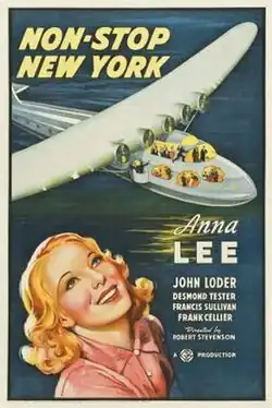 Non-Stop New York (also known as Lisbon Clipper Mystery) is a 1937 British science fiction crime film directed by Robert Stevenson and starring John Loder, Anna Lee and Francis L. Sullivan.[N 1] It is based on the 1936 novel Sky Steward by Ken Attiwill.[2] A woman who can clear an innocent man of the charge of murder is pursued by gangsters onto a luxurious transatlantic flying boat.
