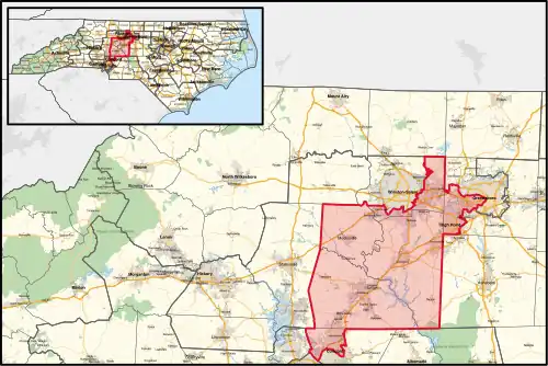 After congressional reapportionment following the 2010 census, the district was shifted northward by the North Carolina General Assembly. From then until 2017, it included portions of Guilford, Alamance, Durham, Granville, and Orange counties, and all of Caswell, Person, Rockingham, Surry, and Stokes counties. In 2015, it was reconfigured again but remained in the same general region.