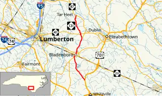 North Carolina Highway 131 (NC 131) is a primary state highway in the U.S. state of North Carolina. It connects the city of Bladenboro to Fayetteville, via NC 87, and Whiteville, via US 701.