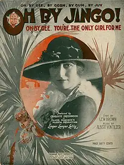 Novelty songs were a major staple of Tin Pan Alley from its start in the late 19th century. They continued to proliferate in the early years of the 20th century, some rising to be among the biggest hits of the era.[7] Varieties included songs with an unusual gimmick, such as the stuttering in "K-K-K-Katy" or the playful boop-boop-a-doops of "I Wanna Be Loved By You", which made a star out of Helen Kane and inspired the creation of Betty Boop; silly lyrics like "Yes! We Have No Bananas"; playful songs with a bit of double entendre, such as "Don't Put a Tax on All the Beautiful Girls"; and invocations of foreign lands with emphasis on general feel of exoticism rather than geographic or anthropological accuracy, such as "Oh By Jingo!", "The Sheik of Araby", and "The Yodeling Chinaman". These songs were perfect for the medium of Vaudeville, and performers such as Eddie Cantor and Sophie Tucker became well known for such songs.