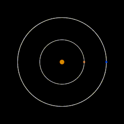 It takes 404 days (1.11 years) to complete an orbit and has a semi-major axis of 1.24±0.02 astronomical units or 1.24 times the Earth-Sun distance, and equivalent to 47.5% of the binary's semi-major axis. This is the highest ratio ever reported.[3] All other S-type planets, orbiting one component of a star system,[8] have much smaller orbits relative to that of the outer star.[9] Nu Octantis Ab therefore is exceptional due to its tight architecture.[3]