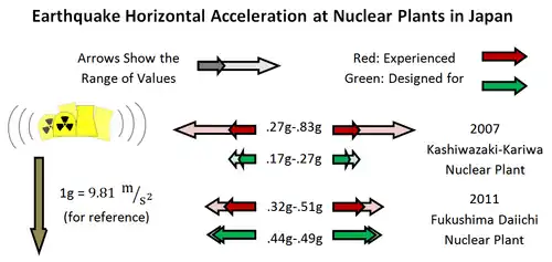 Between 2005 and 2007, three Japanese nuclear power plants were shaken by earthquakes that far exceeded the maximum peak ground acceleration used in their design.[78] The tsunami that followed the 2011 Tōhoku earthquake, inundating the Fukushima I Nuclear Power Plant, was more than twice the design height,[79] while the ground acceleration also slightly exceeded the design parameters.[80]