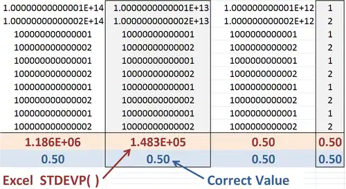 However, the first form keeps better numerical accuracy for large values of x, because squares of differences between x and x leads to less round-off than the differences between the much larger numbers Σ(x2) and (Σx)2 . The built-in Excel function STDEVP, however, uses the less accurate formulation because it is faster computationally.[5]