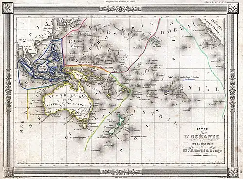 The geographer Conrad Malte-Brun coined the French expression Terres océaniques ('Oceanic lands') c. 1804.[29] In 1814 another French cartographer, Adrien-Hubert Brué, coined from this expression the shorter Océanie,[30] which derives from the Latin word oceanus, and this from the Greek word ὠκεανός (ōkeanós), 'ocean'. The term Oceania is used because, unlike the other continental groupings, it is the ocean that links the parts of the region together.[31] John Eperjesi's 2005 book The Imperialist Imaginary says that Since the mid-19th century, Western cartographers have used the term Oceania to organize and classify the Pacific region.[32]