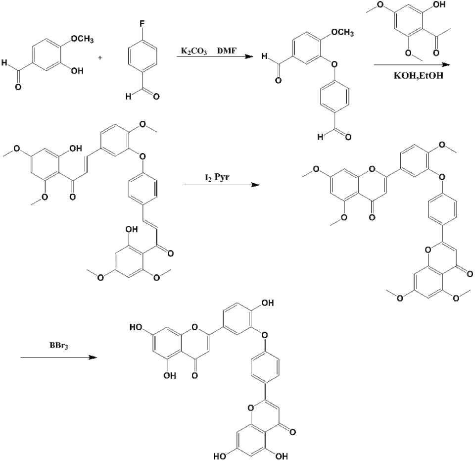 The first total synthesis of ochnaflavone derivatives was achieved by Kawano group in 1973, followed by the Heerden group for the first time reporting the total synthesis the ochnaflavone by constructing a diaryl ether intermediate and assemble the two flavone nuclei through ring cyclization.[2] To date, the field of biochemistry of biflavonoids is still wide open. Little is known about Ochnaflavone of its natural occurrence and biosynthesis.[3]