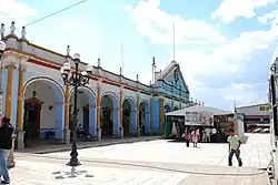 The Rodolfo Morales house is a mansion from the 18th century which he rescued and lived in. Today, the building is a cultural center with an open-air theatre, which can seat 200 people, galleries of work by local artists and a computer center. All activities and resources here are offered free of charge.[4][7][13] The house is located just north of the main square and preserves a number of Morales personal effects, including collages.[1] The building is also home to the Fundación Cultural Rodolfo Morales, A. C (Rodolfo Morales Cultural Foundation), which is a private, nonprofit organization which promotes education and culture in the Ocotlan District of the state of Oaxaca. The Foundation realizes restorations, the maintenance and conservation of architectural monuments, paintings and sculptures and trains young people in restoration work. The foundation was created in 1992 by Rodolfo Morales.[13] The Octolan railroad station was built along the old Ferrocarril San Jerónimo to San Pablo Huixtepec line in 1906. In 1909, a second platform was built.[14]