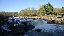 The Youghiogheny River is the busiest section of whitewater east of the Mississippi River. The Lower Yough, a 7-mile (11 km) run, begins at Ohiopyle Falls and ends at the Bruner Run take-out. The Middle Yough begins at the Ramcat put-in near Confluence and ends just above the falls in Ohiopyle. One weekend per year or so, there is a race and festival devoted to the falls, and the state park permits paddlers to run the falls. Only rubber rafts, closed-topped canoes and kayaks are permitted in the river. All visitors must wear life jackets certified by the United States Coast Guard. The Lower Yough River is rated Class III to Class IV on the International Scale of River Difficulty, depending on water conditions; the easier Middle Yough is rated II, and Ohiopyle Falls is rated IV. Boating must be in accordance with the Safety Code of American Whitewater. Inexperienced visitors are encouraged to hire one of the several private outfitters that offer guided trips down the rapids.[4]