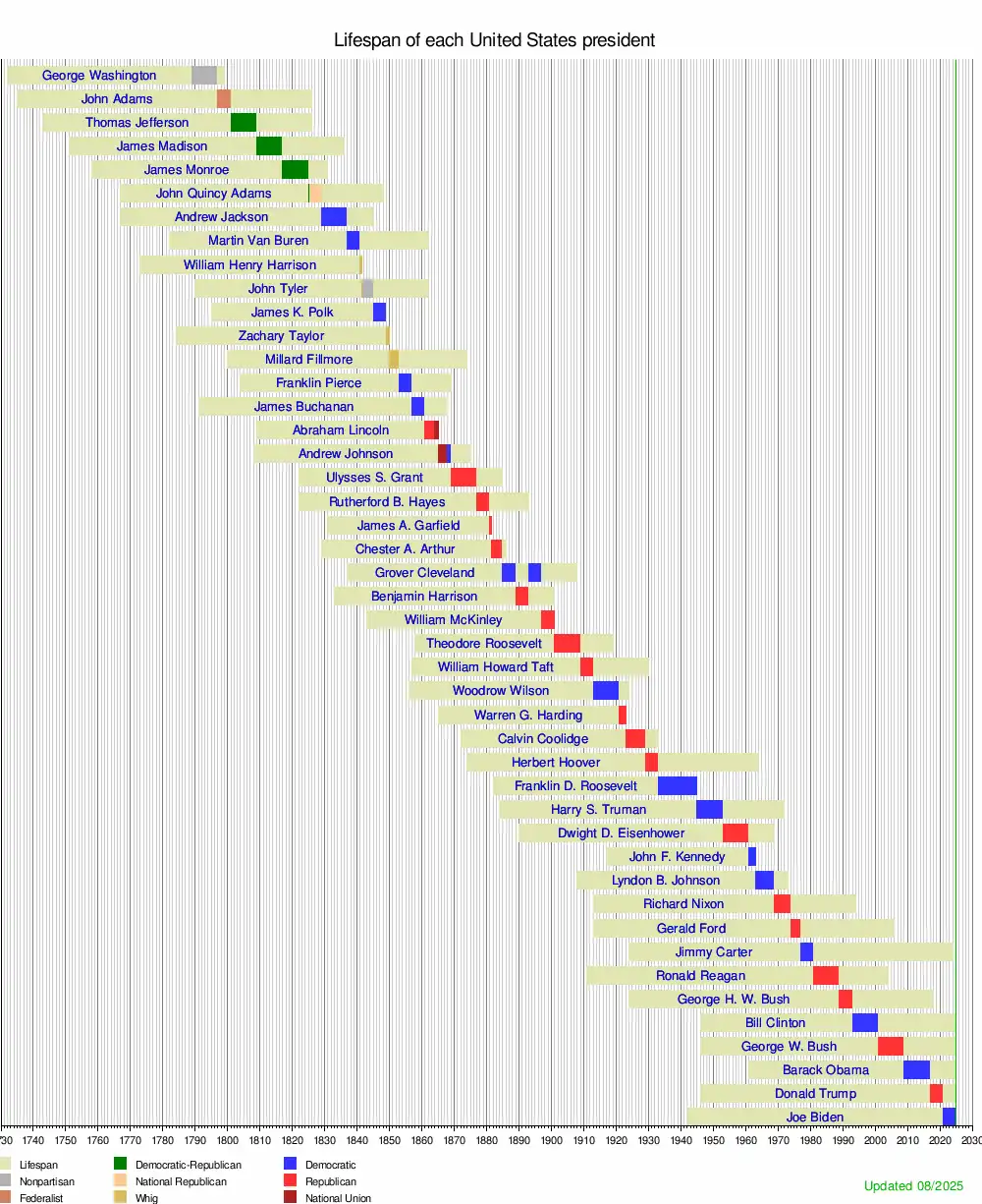 The first table below charts the age of each president of the United States at the time of their presidential inauguration (first inauguration if elected to multiple and consecutive terms), upon leaving office, and at the time of death. Where the president is still living, their lifespan and post-presidency timespan are calculated through August 20, 2025.