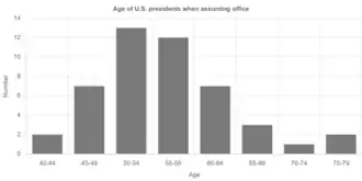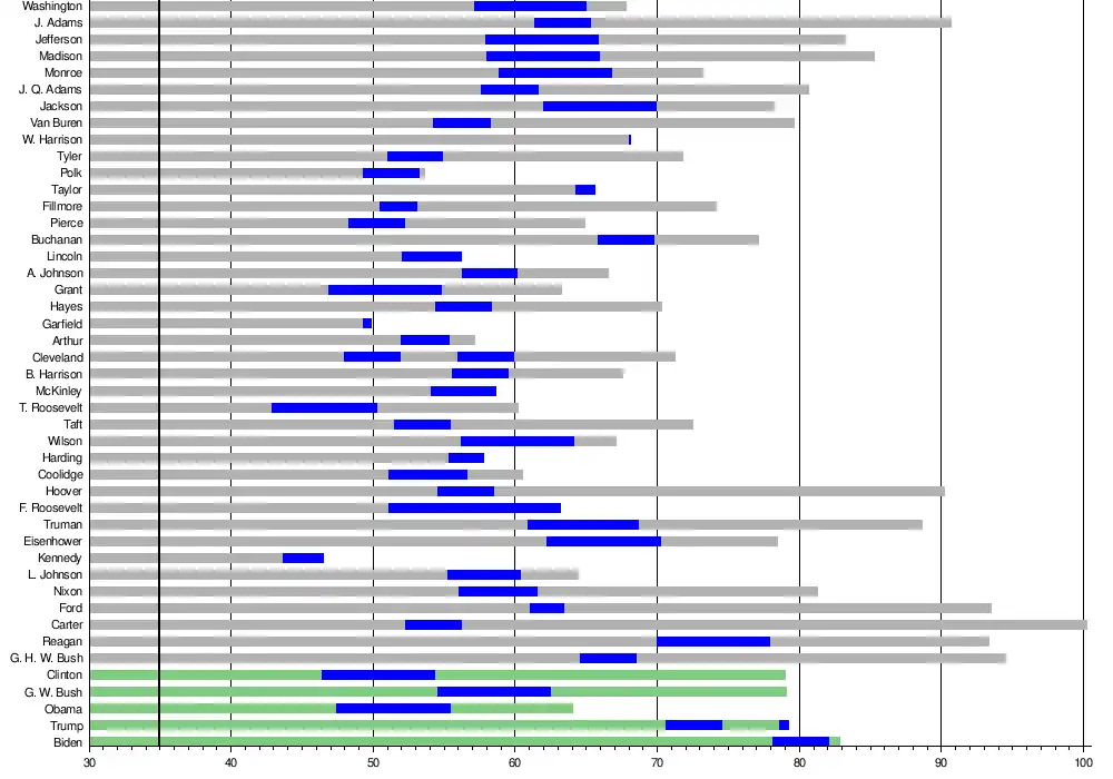 The following chart shows presidents by their age (living presidents in green), with the years of their presidency in blue. The vertical black line at 35 years indicates the minimum age to be president.