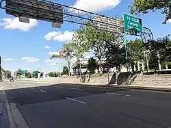 East of the QEW, Highway encounters an interchange with Dorchester Road as both cross the Queenston-Chippawa Power Canal.[7] This interchange was originally a traffic circle that was removed in the early 1970s.[8] The numerous lanes from the QEW interchange to the west begin to converge between residential subdivisions east of Dorchester Road, gradually narrowing to four through lanes at the Drummond Road interchange.[7] After passing beneath Portage Road, the route widens on approach to an at-grade intersection with Stanley Avenue. This intersection is the eastern end of both the freeway segment of the route and the signed King's Highway 420; east of Stanley Avenue the route is signed as Niagara Regional Road 420 and known as Falls Avenue.[9][10]