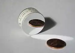 Optical flats in case. About 2.5 centimetres (1 in) in diameter. The third flat from the left is standing on edge, showing the thickness.