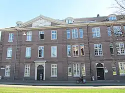 The Oranje-Nassau Kazerne is the largest of a series of military buildings along the Singelgracht canal. These buildings, on either side of the Muiderpoort city gate, were constructed in the course of the 19th century along the city walls protecting the eastern side of the city. The buildings were part of the Hollandse Waterlinie, a defensive line around Amsterdam to protect the city from foreign invaders. The Oranje-Nassau Kazerne was built in the years 1810-1813 between the 17th-century bastions Outewaal and Oosterbeer to house the city's infantry garrison and the troops manning the defenses around the city.[1][3][5] The windmill De Gooyer on the bastion Oosterbeer had to be moved because the barracks took away too much wind. In 1814, it was moved to nearby Funenkade.[6]