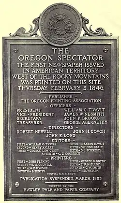 The Oregon Printing Association (OPA) was formed in Oregon City with the purpose of establishing a newspaper. The OPA consisted of a group of seven, including William G. T'Vault, James W. Nesmith, John P. Brooks, George Abernethy, John H. Couch, Robert Newell, and John E. Long.[4] It formally declared that the press they acquired was never to be used "...by any party for the purpose of propagating sectarian principles or doctrines; nor for the discussion of exclusive party politics." The group secured a press from New York.[5][6]