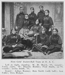 The OAC women's basketball team was more formally organized by the 1899–1900 academic year, with Bessie Smith elected team president as well as a slate of officers, including a vice president, secretary, and treasurer.[6] Scheduling was handled by the team manager, Mr. J.H. Gallagher.[6]