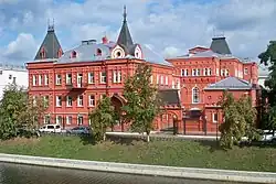 In central Oryol, streets fan out from the fortress; two main axes are the Upper and Lower Korchak Roads. Opposite the fortress was probably a second marketplace in the Zaotsk section, where the dragoon settlements had a relatively-regular layout along the river. Away from the river, the grid becomes a fan. The city – its fortress, three marketplaces, two monasteries and a number of parish churches – was developed from the river. Its structure was visible from the Oka: the central fortress, the fan-shaped center and the grid of the Zaotsk settlements. The city was connected by bridges, making Oryol a military fortress and a trade center.[13]