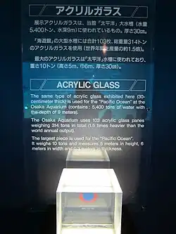 Description of acrylic glass. The amount of acrylic glass used in the Osaka Aquarium was 1.5 times the annual world production at that time.