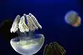 The walk-through aquarium displays marine life in several habitats comprising 27 tanks in 16 main exhibits with a total volume of 10,941 tons of water. The habitats are from the Ring of Fire area of the Pacific Ocean, including the Aleutian Islands (tufted puffins), Monterey Bay (California sea lions and Spotted seals), Gulf of Panama (South American coatis, long-spine porcupinefish and blotcheye soldierfish), Ecuador Rain Forest (arapaima, red-bellied piranhas, capybaras & green iguanas), Antarctica (Adélie, gentoo & king penguins), Tasman Sea (Pacific white-sided dolphins) and Great Barrier Reef (palette surgeonfish, pennant coralfish & threadfin butterflyfish), Seto Inland Sea (common octopuses, Japanese spiny lobsters & red seabreams), Coast of Chile (Japanese anchovies and South American pilchards), Cook Sea Strait (loggerhead sea turtles, deepwater burrfish & scarlet wrasse), Japan Deeps (Japanese spider crabs, Australian ghostsharks & Hilgendorf's saucords) and a jellyfish gallery (moon jellyfish & northern sea nettles).[12][13] The Aqua Gate at the entrance and the Jellyfish corner are recent facilities built in 1998.[2]