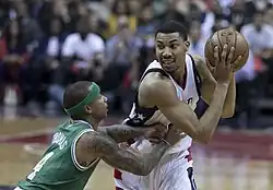 Porter was selected with the third overall pick in the 2013 NBA draft by the Washington Wizards.[5] However, he missed training camp and the first 18 games of the 2013–14 season with a hip injury. He made his NBA debut on December 6, going scoreless in 14 minutes in a 109–105 overtime loss to the Milwaukee Bucks.[6] He twice scored a season-high nine points in April 2014.[7] On November 1, 2014, he scored 19 of his career-high 21 points in the second half of the Wizards' 108–97 win over the Bucks.[8] On November 7, 2015, he set a new career high with 23 points in a 114–99 loss to the Atlanta Hawks.[9] On December 12, 2015, he scored a career-high 28 points in a 114–111 win over the Dallas Mavericks.[10]