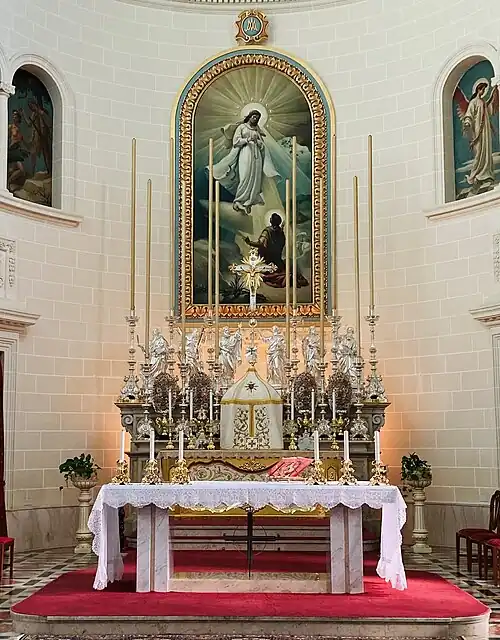 In every church, the altar is the central work. The altar of this church is a beautiful and artistic work of marble from Pietra Santa di Lucca, Italy. It was put into place in October 1961. On the facade of the first step, there are ten medallions with the figures of some prophets and other biblical characters, which we consider to be figures of Our Lady. In the middle of the altar is the bronze tabernacle, covered from the inside with silver sheets. The design of the altar is by Mr. G. Galea. As we mentioned, the altar was consecrated by the archbishop, Mons. Michael Gonzi, on May 12, 1962.[7]