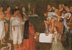Meeting them at the door of the chapel was the 78-year-old Ana Lucia, the wife of Pedro Antes (the caretaker and custodian of the beloved statue). Feeling pity for the grieving family, she exhorted them to have confidence in The Virgin, who could restore the child to them. Taking the statue from its altar in the sacristy where it had been consigned because of its poor condition, Ana Lucia laid it near the child's dead body. In a few moments, they detected a slight movement under the shroud. The parents quickly unwrapped the cloth to discover the child well and unharmed. This first miracle of Our Lady of San Juan de Los Lagos became known in neighboring villages and towns. Numerous other miracles and favors followed, until now Our Lady is venerated by pilgrims from throughout Mexico and the United States.[4]