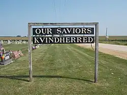 The cemetery is a rectangular parcel of land that measures 348 by 446 feet (106 by 136 m), and contains roughly 3.1 acres (1.3 ha).[3] The original section was deeded to the church in 1865, although the first burial was recorded in 1864. The earliest grave marker, however, dates from 1861. Several large cedar trees were located in the cemetery that marked it out from the farmland that surrounds the cemetery. It was originally surrounded by a steel fence with an entrance gateway. Above the gate was a sign that read "Kvindherred Cemetery". It was replaced by a wooden sign along the road in front of the cemetery that reads "Our Saviors Kvindherred". The cemetery is located 1,700 feet (520 m) north of the church along the same road.