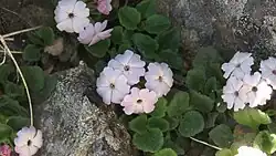 Ourisia fragrans plants are perennial, ascending to erect, subrosette herbs. The short stems are 0.9–2.7 mm wide, and glabrous (hairless) or hairy with short glandular hairs. Leaves are opposite or tightly clustered in a subrosette, petiolate, 6.0–21.1 mm long by 4.5–16.0 mm wide (length: width ratio 1.1–1.5:1). Leaf petioles are 4.2–26.9 mm long and sparsely to densely hairy with short glandular hairs. Leaf blades are ovate or broadly ovate, rarely narrowly ovate, widest below the middle, with a rounded or rarely subacute apex, cuneate base, and notched or crenate edges. Both surfaces of the leaf are usually densely hairy with a mixture of short glandular and non-glandular hairs (or sometimes glabrous on lower surface), and the lower surface is also punctate. Inflorescences are ascending or erect, with hairy racemes up to 24 cm long, and with 1–4 flowering nodes and up to 7 or more total flowers per raceme. Each flowering node has 2 flowers and 2 bracts that are narrowly obovate, obovate, broadly obovate, lanceolate or narrowly ovate. The bracts are similar to the leaves but smaller and sometimes widest above the middle, 5.7–14.0 mm long and 4.0–8.7 mm wide and petiolate (lower bracts only) or sessile. The flowers are borne on a pedicel that is up to 22.8 mm long and sparsely to densely hairy with short glandular hairs. The calyx is 6.0–10.1 mm long, regular, with all 5 lobes equally divided to one-half to three-quarters the length of the calyx, each with 3 prominent purple veins and acute, glabrous or sparsely to densely hairy on the outside and margins with a mixture of short glandular and non-glandular hairs. The corolla is 15.8–19.7 mm long (including a 6.0–14.1 mm long corolla tube), regular, straight, tubular-funnelform, white, pink or purple, and glabrous or hairy with glandular hairs on the outside, and glabrous inside. The corolla lobes are 4.2–6.4 mm long, spreading or explanate, obcordate and deeply emarginate. There are 5 stamens which are of equal length, included or reaching the coreolla tube opening. The style is 1.7–3.5 mm long, included, with an emarginate or capitate stigma. The ovary is 0.6–3.2 mm long. Fruits are glabrous capsules with loculicidal dehiscence, and fruiting pedicels are 7.0–8.5 mm long. The number of seeds in each capsule is unknown, and seeds are 1.0–1.1 mm long and about 0.6 mm wide, elliptic, with a regular two-layered, reticulate (having a net-like pattern) seed coat with thick, smooth, shallow, primary reticula.[2]