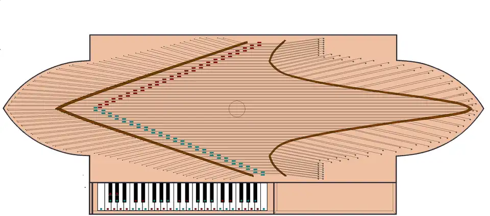 In the oval spinet, the strings were placed parallel to the keyboard, the same arrangement as in a virginals. This can be seen in the following schematic false-color diagram of the 1690 oval spinet, showing the outline, keyboard, bridges, and string arrangement. The diagram and those that follow are colorizations of an original by Tony Chinnery.