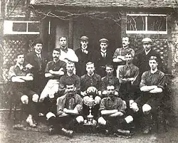 Oxford United was founded on 27 October 1893 as Headington Football Club at the Britannia Inn, Headington in a meeting called by a local doctor, Robert Hitchings, as a way for the cricketers of Headington Cricket Club to maintain their fitness during the winter break. The fellow founder was the Revd John Scott-Tucker, vicar at St. Andrew's Church, who was appointed first president of the club.[1] The suffix United was added in 1911 after merging with Headington Quarry.[12] The club's first football match played was against Cowley Barracks. Headington had no regular home until 1913, when they were able to purchase Wootten's Field on London Road, but this was redeveloped in 1920, forcing the club to move.[12] A permanent home was found in 1925, when they purchased the Manor Ground site on London Road.[12] The facility was used as a cricket pitch in the summer, and a football pitch in the winter. In 1899, six years after their formation, Headington United joined the Oxfordshire District League Second Division, where they competed until the outbreak of the First World War; the Second Division was renamed the Oxfordshire Junior League after the resumption of football in 1919. In 1921, the club was admitted into the Oxon Senior League.[4] The first season included a 9–0 victory, with eight of those goals coming from P. Drewitt. This remains a record for the highest number of goals scored by an Oxford player in a first-team match.[7] At this time a small rivalry existed with Cowley F.C., who were based a few miles south of Headington. During a league game on May Day, the referee gave two penalties to Cowley; supporters broke past security and players, resulting in the referee being "freely baited".[5] The first FA Cup tie played was in 1931, against Hounslow F.C. in the Preliminary Round, ending in an 8–2 defeat for Headington.[8] United spent two seasons in the Spartan League in 1947 and 1948, finishing fifth and fourth respectively. It was around this time that the cricket team left the Manor and moved to new premises near Cowley Barracks.