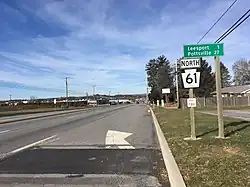 Past this intersection, PA 61 passes a mix of businesses and fields before it enters the borough of Leesport. Here, the road turns into four-lane undivided South Centre Avenue and runs past homes and some businesses. The route becomes North Centre Avenue and passes more residences, running to the east of a Reading Blue Mountain and Northern Railroad line.[3][4]