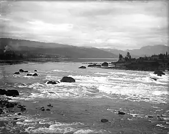 Hunt's group found a band of Liksiyu on 8 January, whom hosted the downtrodden expedition for a week.[64] Meals of dried mule deer meat and loafs of pounded Camas bulbs were provided during their stay. While exploring the area, Hunt found out from particular Liksiyu that there was an active white fur trader in the area. This would turn out to be Jacques Raphaël Finlay, located at the NWC Spokane House.[64] On 21 January, the expedition finally reached the banks of the Columbia River. Hunt soon entered discussions with the Wasco-Wishram when entering their villages. It was here he learned the destruction of the Tonquin the previous year.[64] The remaining three horses of the party were used to purchase two canoes from Wasco merchants. Several portages were required on the Columbia, especially at the Cascade Rapids. The main body of the expedition reached Fort Astoria on 15 February to much fanfare. Besides Hunt there was thirty men, along with Marie Aioe Dorion and her two children on six canoes.[39] McDougall was apprehensive about feeding all these additional people, a sentiment Franchère shared,[60] as the post had recently faced issues with provisions.[39] Due to seasonal salmon runs harvested by various Chinookans however, there was a sizable food supply at Fort Astoria.