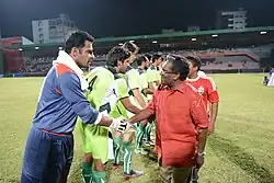 That saw the end of Lutfi's reign, with Serbian coach Zaviša Milosavljević taking over in November 2011 right before the 2011 SAFF Championship.[36] Despite having little time to influence the team, Zavisa managed to hold Bangladesh 0–0, Maldives 0–0 and Nepal 1–1 in the India-hosted 2011 SAFF Championship. However, they were unable to progress into the semi-finals and returned home.