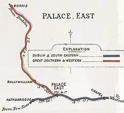 Palace East railway station was the only location where the Dublin, Wicklow and Wexford Railway was connected to the Great Southern and Western Railway and the rest of Irish rail network until the opening of the City of Dublin Junction Railway in 1891.[1] This connection was described by Ahrons as "in the wilds of Wexford, which was of no use to anybody".[1] Palace East was the scene of a staged head-on collision during the Irish Civil War.[2]